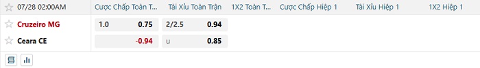 - Kèo tỷ số H1 Cruzeiro vs Ceara: 1-0