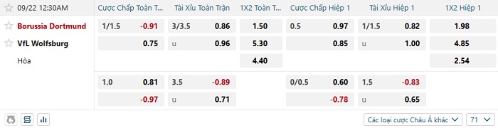 - Kèo tỷ số H1 Dortmund vs Wolfsburg: 1-0