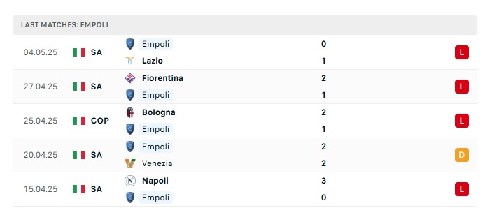 Hiện tại, Empoli vẫn còn đó 1 cơ hội le lói để trụ hạng thành công dù tỷ lệ và phong độ của họ đang rất thấp. Nên biết rằng Empoli sau 35 vòng đấu đang đứng áp chót trên BXH với chỉ 25 điểm. Trong khi đó thì đội khách Parma lúc này đang có mặt ở vị trí thứ 15 trên BXH với 32 điểm. Như vậy, các chuyên gia đều tin rằng trận đấu này sẽ có đội chủ nhà hoàn toàn đủ khả năng giành chiến thắng.