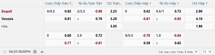 Soi kèo châu Á, kèo Empoli vs Venezia