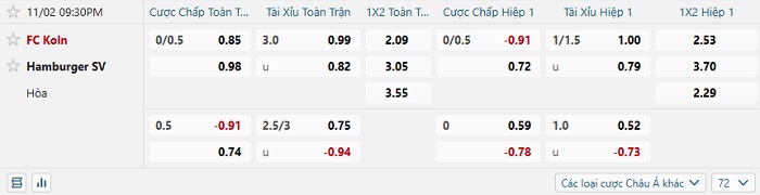 Bảng tỷ lệ kèo nhà cái FC Koln vs Hamburger