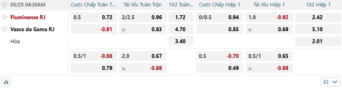 Bảng tỷ lệ kèo bóng đá Fluminense vs Vasco da Gama