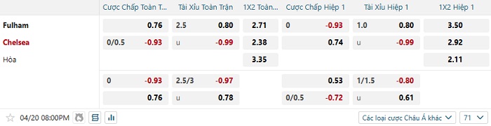 Bảng tỷ lệ kèo bóng đá Fulham vs Chelsea