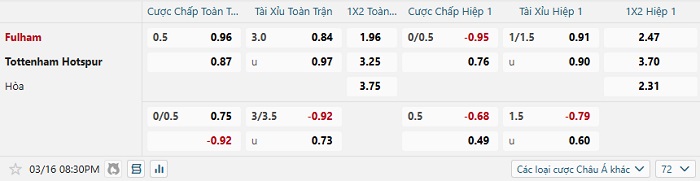 Bảng tỷ lệ kèo bóng đá Fulham vs Tottenham