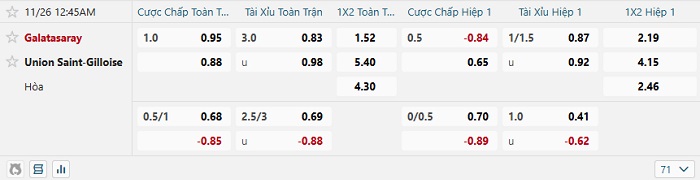 Bảng tỷ lệ kèo bóng đá Galatasaray vs Union Saint-Gilloise
