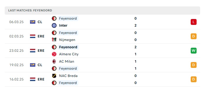 Hiện tại, phong độ thi đấu của Inter Milan vẫn đang rất cao so với đối thủ trong thời gian qua. Cụ thể thì Inter Milan đã thắng 4, hòa 1 và chỉ thua 1 trong 6 trận đấu gần đây nhất của mình. Trong khi đó thì Feyenoord đang chỉ thắng 2, hòa 3 và thua 1 trong 6 trận đấu gần đây nhất. Qua đó, các chuyên gia đều tin rằng đội chủ nhà sẽ tiếp tục dễ dàng đánh bại đối thủ ở ngày thi đấu hôm nay.
