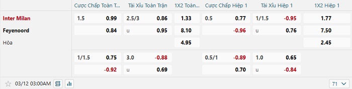 Bảng tỷ lệ kèo bóng đá Inter Milan vs Feyenoord