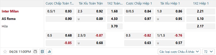 Bảng tỷ lệ kèo bóng đá hôm nay Inter Milan vs Roma