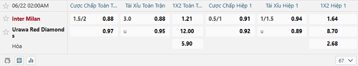 Bảng tỷ lệ kèo bóng đá hôm nay Inter Milan vs Urawa Red