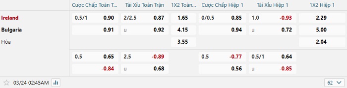 Soi kèo châu Á, kèo Ireland vs Bulgaria