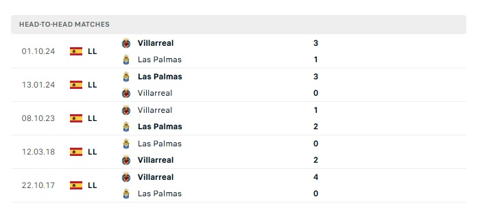 Lịch sử đối đầu Las Palmas vs Villarreal