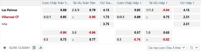 Bảng tỷ lệ kèo bóng đá Las Palmas vs Villarreal