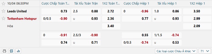 Bảng tỷ lệ kèo bóng đá hôm nay Leeds Utd vs Tottenham