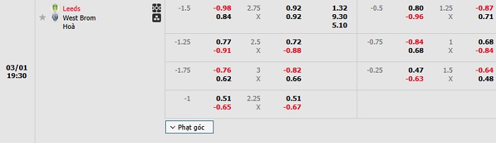 Bảng tỷ lệ kèo bóng đá Leeds Utd vs West Brom
