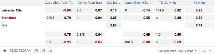 Bảng tỷ lệ kèo bóng đá Leicester City vs Brentford