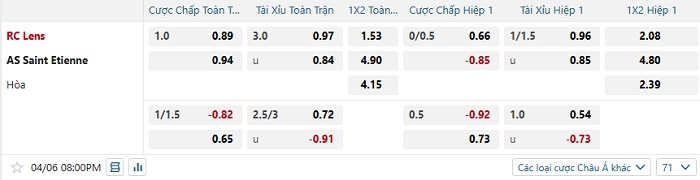 Bảng tỷ lệ kèo bóng đá Lens vs Saint Etienne
