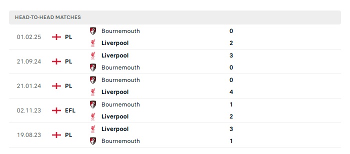 Lịch sử đối đầu Liverpool vs Bournemouth