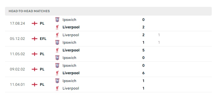 Lịch sử đối đầu Liverpool vs Ipswich