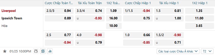 Bảng tỷ lệ kèo bóng đá Liverpool vs Ipswich
