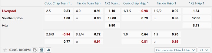 Bảng tỷ lệ kèo bóng đá Liverpool vs Southampton
