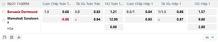 Hiện tại, nhà cái đang niêm yết cho Dortmund mức chấp -1 1/2 và họ có thừa sự tự tin để mang về lợi nhuận cho người hâm mộ. Cần biết rằng 10 trận đấu gần nhất của Dortmund, họ đã có cho mình 8 lần thắng kèo, chỉ thua 2. Trong khi đó thì nên biết rằng Mamelodi đã toàn thua kèo cả 2 trận đấu liên tiếp. Do đó, đầu tư vào đội khách sẽ là lựa chọn an toàn nhất dành cho người hâm mộ.