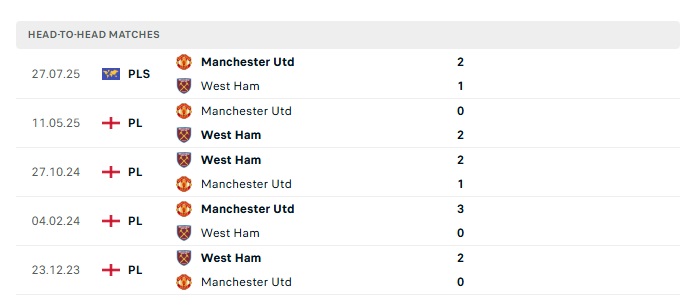 Lịch sử đối đầu Man Utd vs West Ham Utd