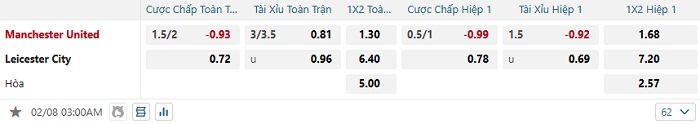 Bảng tỷ lệ kèo bóng đá Manchester Utd vs Leicester City