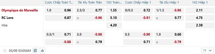 Bảng tỷ lệ kèo bóng đá Marseille vs Lens