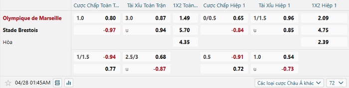 Bảng tỷ lệ kèo bóng đá Marseille vs Stade Brestois