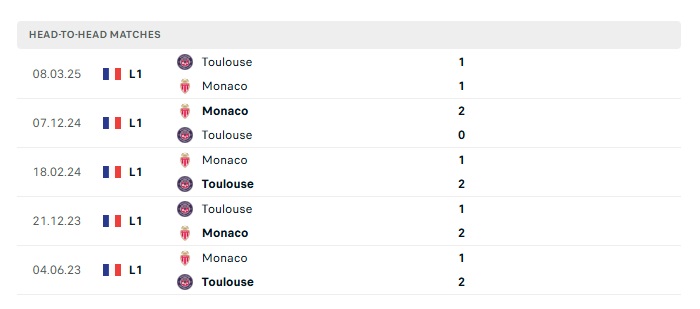 Lịch sử đối đầu Monaco vs Toulouse