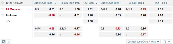 Soi kèo châu Á, kèo Monaco vs Toulouse