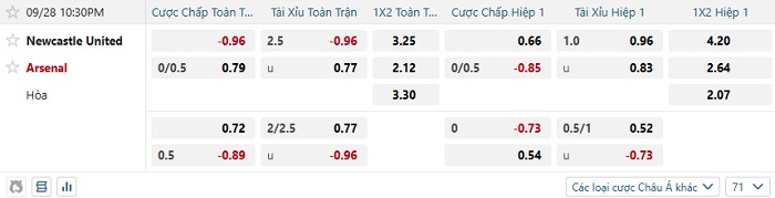 Bảng tỷ lệ kèo bóng đá hôm nay Newcastle vs Arsenal