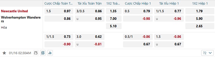 Bảng tỷ lệ kèo bóng đá Newcastle vs Wolves