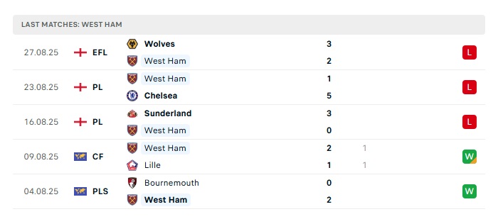- Phong độ gần đây West Ham Utd