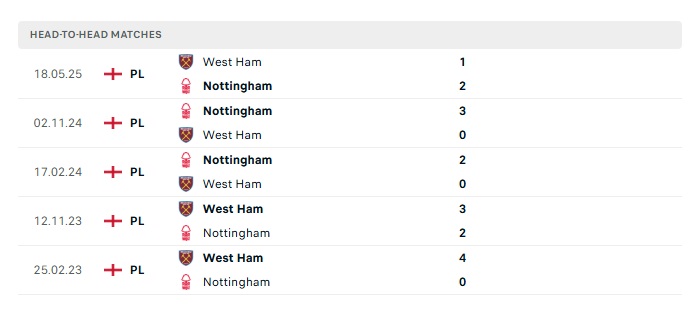 Lịch sử đối đầu Nottingham Forest vs West Ham Utd
