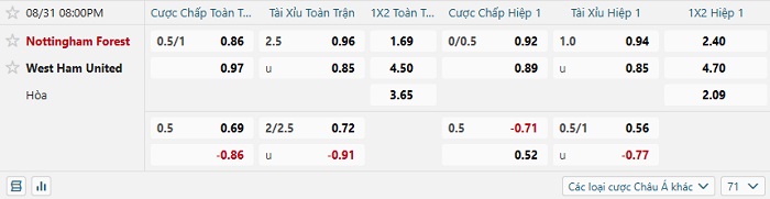 Bảng tỷ lệ kèo bóng đá Nottingham Forest vs West Ham Utd