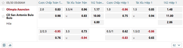 - Kèo tỷ số H1 Olimpia vs San Antonio Bulo Bulo: 0-0