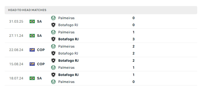 - Kèo tỷ số H2 Palmeiras vs Botafogo: 0-0