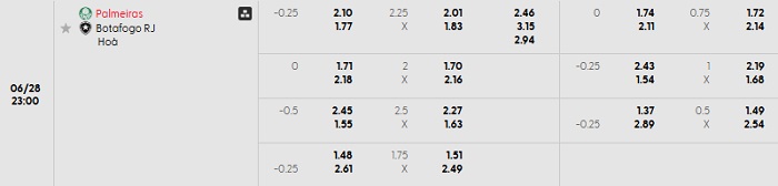 Bảng tỷ lệ kèo bóng đá Palmeiras vs Botafogo