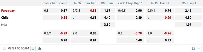 Bảng tỷ lệ kèo bóng đá Paraguay vs Chile
