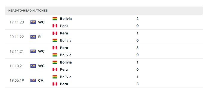Lịch sử đối đầu Peru vs Bolivia