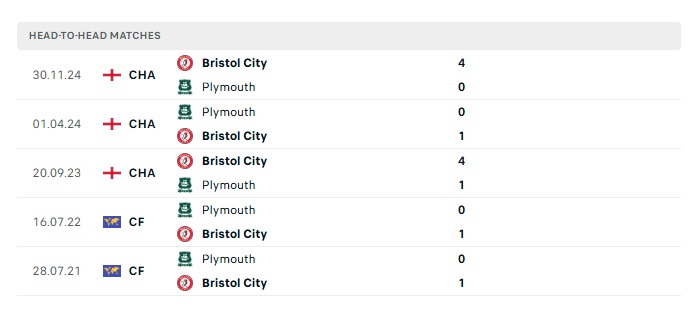 Lịch sử đối đầu Plymouth Argyle vs Bristol City