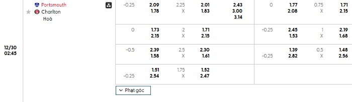 Bảng tỷ lệ kèo bóng đá Portsmouth vs Charlton Athletic