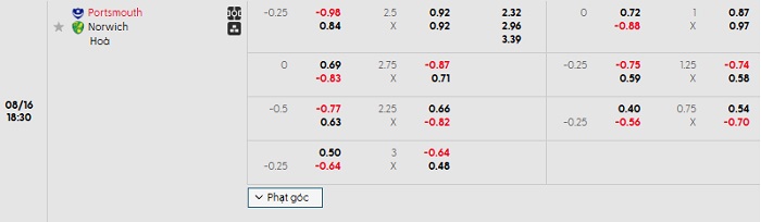 - Kèo tỷ số H1 Portsmouth vs Norwich: 1-0