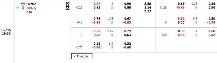 Bảng tỷ lệ kèo bóng đá Preston North End vs Burnley