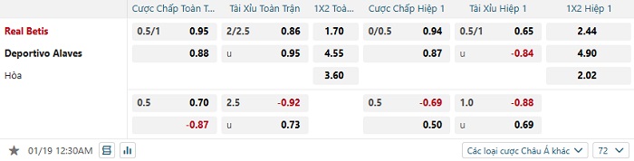 Bảng tỷ lệ kèo bóng đá Real Betis vs Alaves
