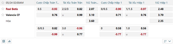 • Kèo tỷ số H1 Real Betis vs Valencia: 0-0