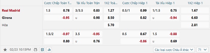 Bảng tỷ lệ kèo bóng đá Real Madrid vs Girona