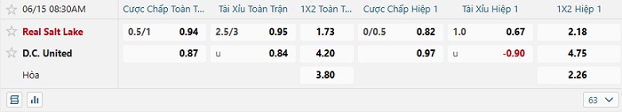 Bảng tỷ lệ kèo bóng đá hôm nay Real Salt Lake vs D.C United