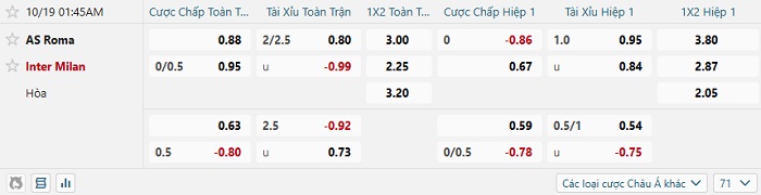Bảng kèo bóng đá Roma vs Inter Milan